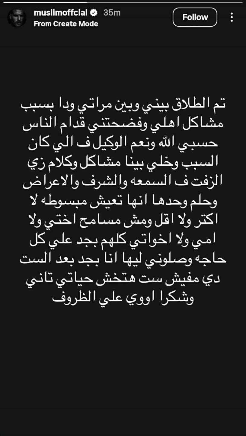 أعلن المطرب الشعبي مسلم انفصاله عن زوجته، عبر خاصية "الاستوري" بحسابه الرسمي بموقع الصور والفيديو "إنستجرام"
